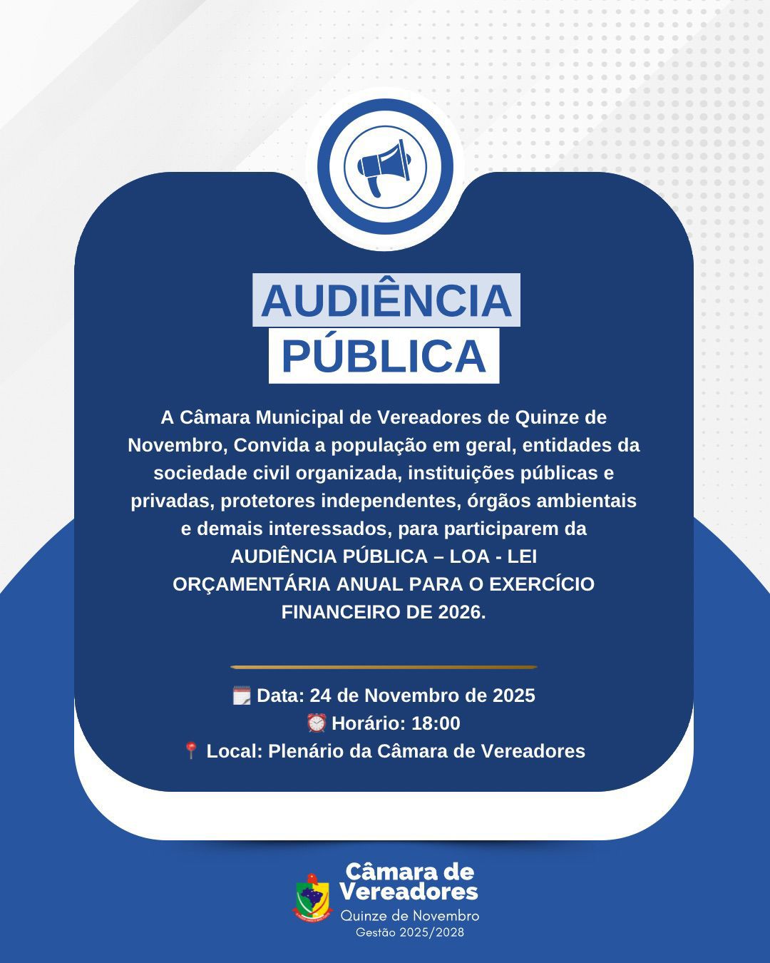 A população de Quinze de Novembro está convidada a participar da audiência pública sobre a Lei Orçamentária Anual (LOA) para o exercício de 2026, que será realizada nesta segunda-feira, dia 24 de novembro, às 18h, no plenário da Câmara Municipal de Vereadores.
