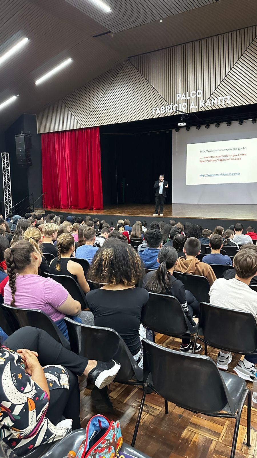 Na manhã desta terça-feira (4), alunos do 7º e 8º ano da Rede Municipal de Ensino participaram de uma palestra sobre educação fiscal na Casa de Cultura de Ibirubá. A atividade foi conduzida por Paulo Sanches, da BUSCAR Assessoria e Sistemas, empresa reconhecida por sua atuação em soluções tecnológicas e serviços de assessoria.