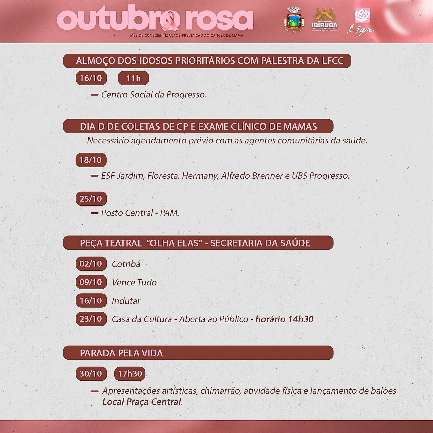 Com essa programação diversificada, o município reforça a importância da prevenção e do diagnóstico precoce do câncer de mama, além de promover momentos de cultura, integração e conscientização junto à comunidade.