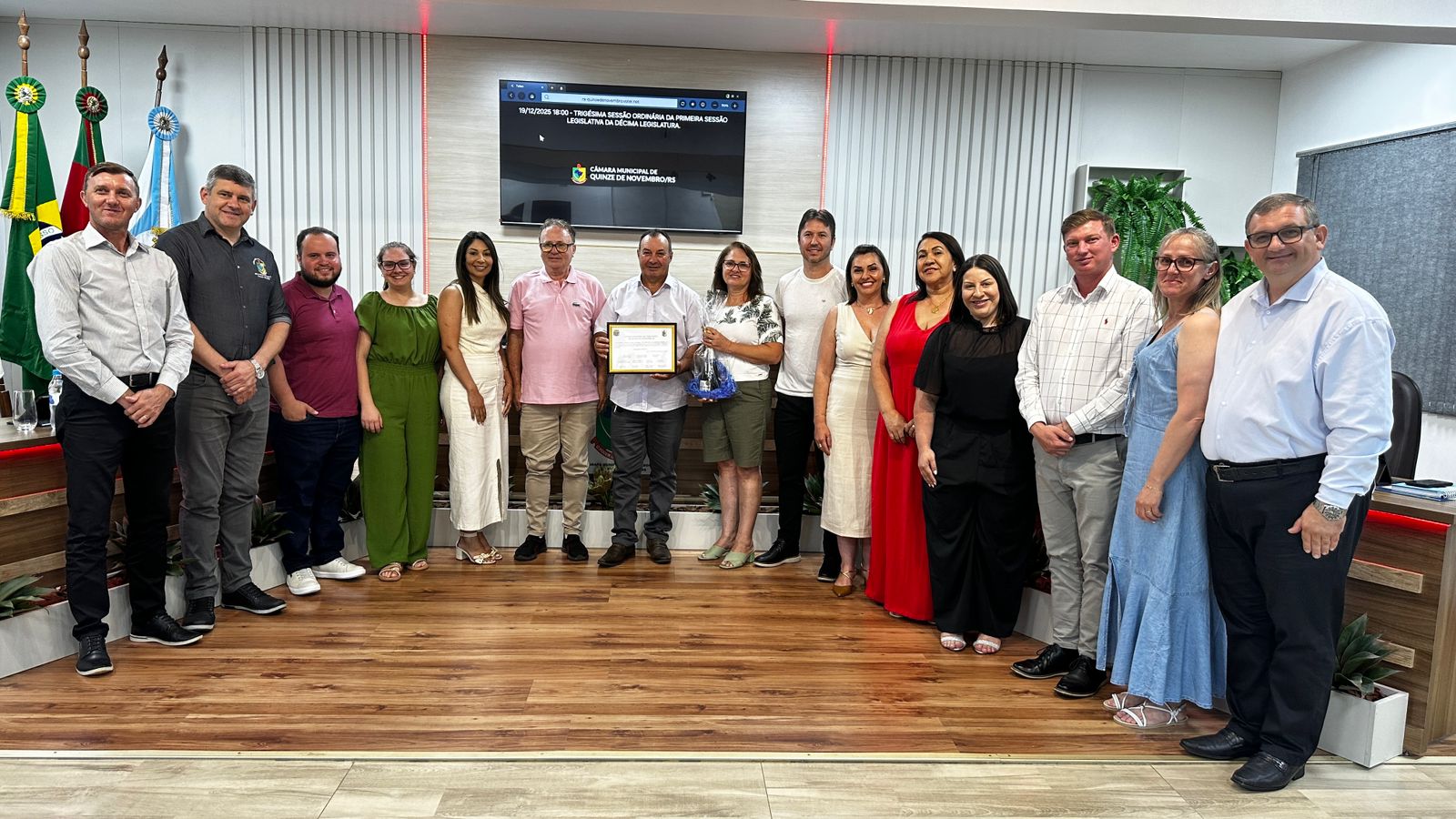 A Câmara de Vereadores de Quinze de Novembro realizou uma justa e merecida homenagem ao servidor público municipal Adilson Luiz Filimberti, em reconhecimento aos 37 anos de serviços prestados à comunidade, marcados pelo compromisso com a ética, a responsabilidade e o zelo pelo interesse público.